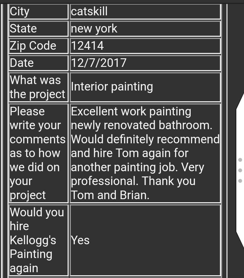 "Kellogg's painting did a very nice job painting our home. They were punctual and very professional." Paul G. Catskill, NY